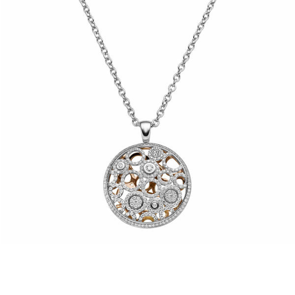 Ref. 21-0952476-1000 - Juwelenkunst in Perfektion vermittelt dem Schmuckstück den Ausdruck von Dreidimensionalität und Leichtigkeit. Die Rückseite des Anhängers ist in Roségold gearbeitet mit offenen Kreisen, die Vorderseite greift diese Struktur wieder auf, ausgefasst mit großen und kleinen Brillanten. Ein Anhänger in ästhetischer Eleganz.