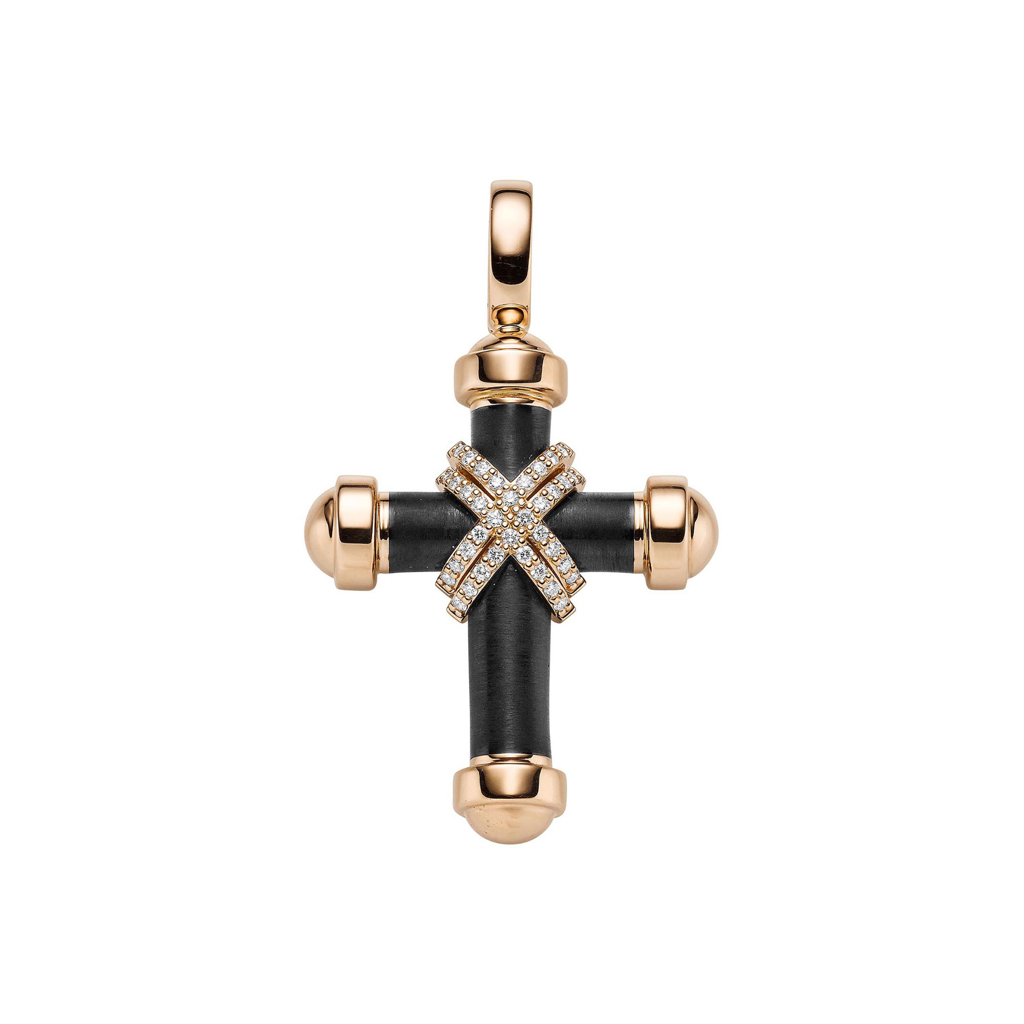 Ref. 21-0963873-1000 - Das große Kreuz ist mit schwarzem mattiertem Kaltemaille gearbeitet. Das Zusammenspiel von Roségold und den Brillanten im offenem Überschlag wirkt sehr luxuriös.