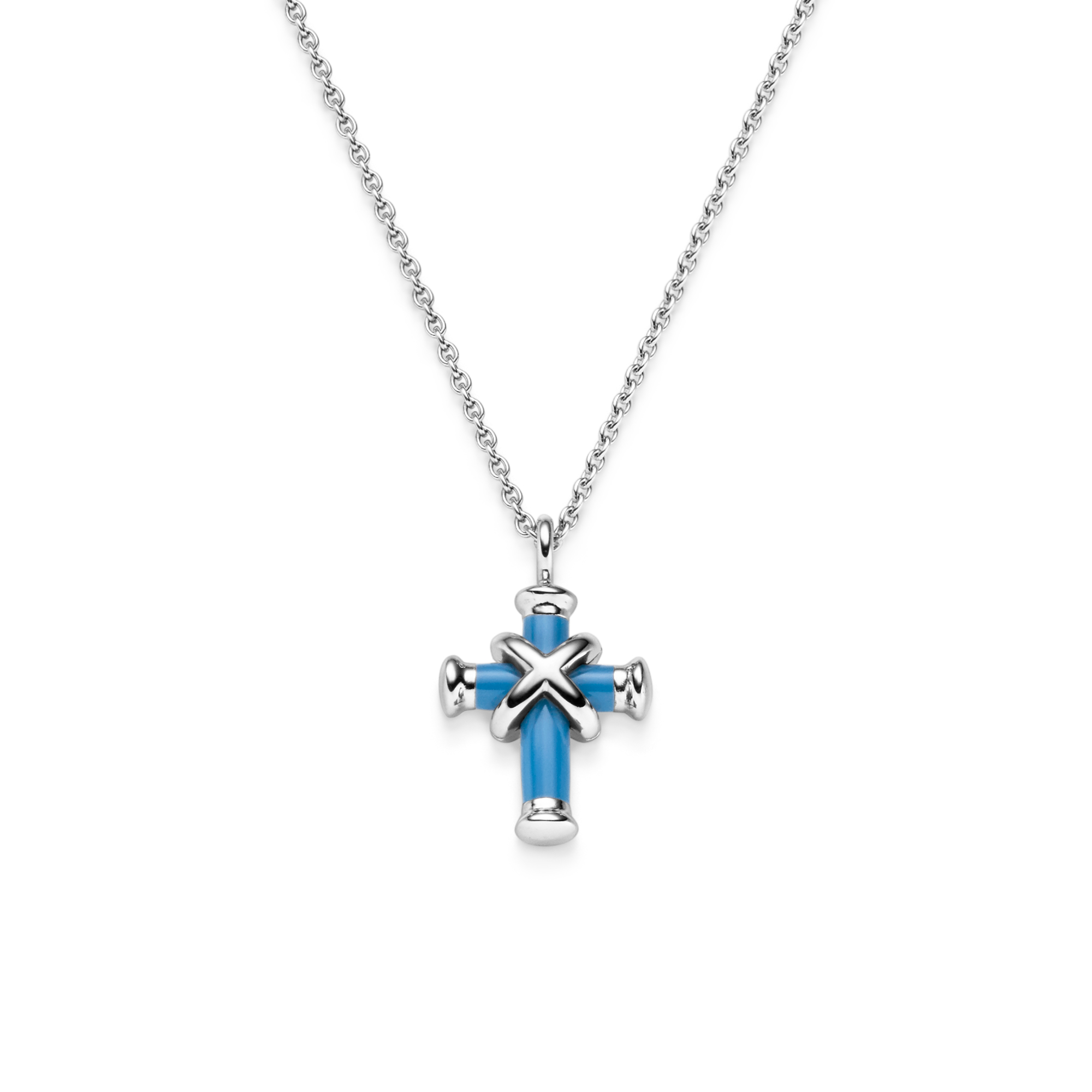Ref. 34-1035771-0004 - Das Leo Wittwer Kreuz ist eine Ikone der Manufaktur. Diese Variante des Kreuzes setzt ein Statement mit modernem Look-and-Feel. Das minimalistische Design aus poliertem Weißgold wird ergänzt durch hellblaues Kaltemaille, das dem Anhänger eine Ausstrahlung von kühler Eleganz verleiht. Der typische Überschlag ist ebenfalls in poliertem Weißgold gehalten, der durch den Kontrast zum Kaltemaille besonders gut zur Geltung kommt und das unverkennbare Design des Kreuzes unterstreicht. Das Kreuz hängt an einer filigranen Kette aus Weißgold, die angenehm auf der Haut liegt und den stilvollen Schmuck mit höchstem Tragekomfort verbindet.