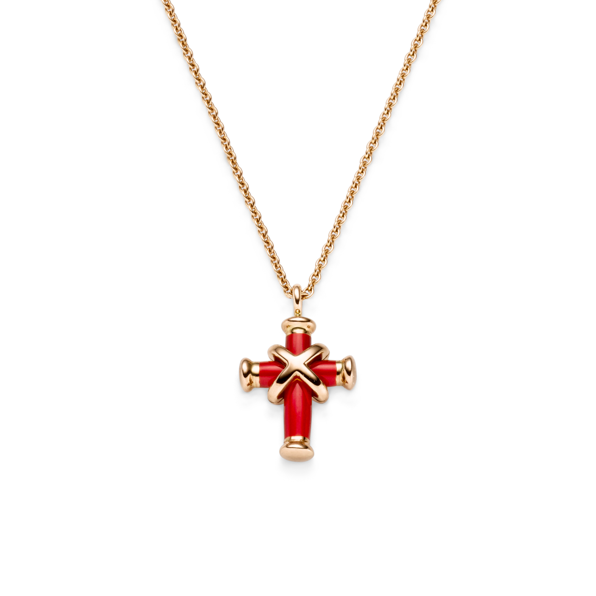 Ref. 34-1035773-0003 - Das Leo Wittwer Kreuz ist eine Ikone der Manufaktur. Diese Variante des Kreuzes setzt ein Statement mit modernem Look-and-Feel. Das minimalistische Design aus poliertem Roségold wird ergänzt durch leuchtend rotes Kaltemaille, das alle Blicke auf sich zieht. Der typische Überschlag ist ebenfalls in poliertem Roségold gehalten, der durch den Kontrast zum Kaltemaille besonders gut zur Geltung kommt und das unverkennbare Design des Kreuzes unterstreicht. Das Kreuz hängt an einer filigranen Kette aus Roségold, die angenehm auf der Haut liegt und den stilvollen Schmuck mit höchstem Tragekomfort verbindet.
