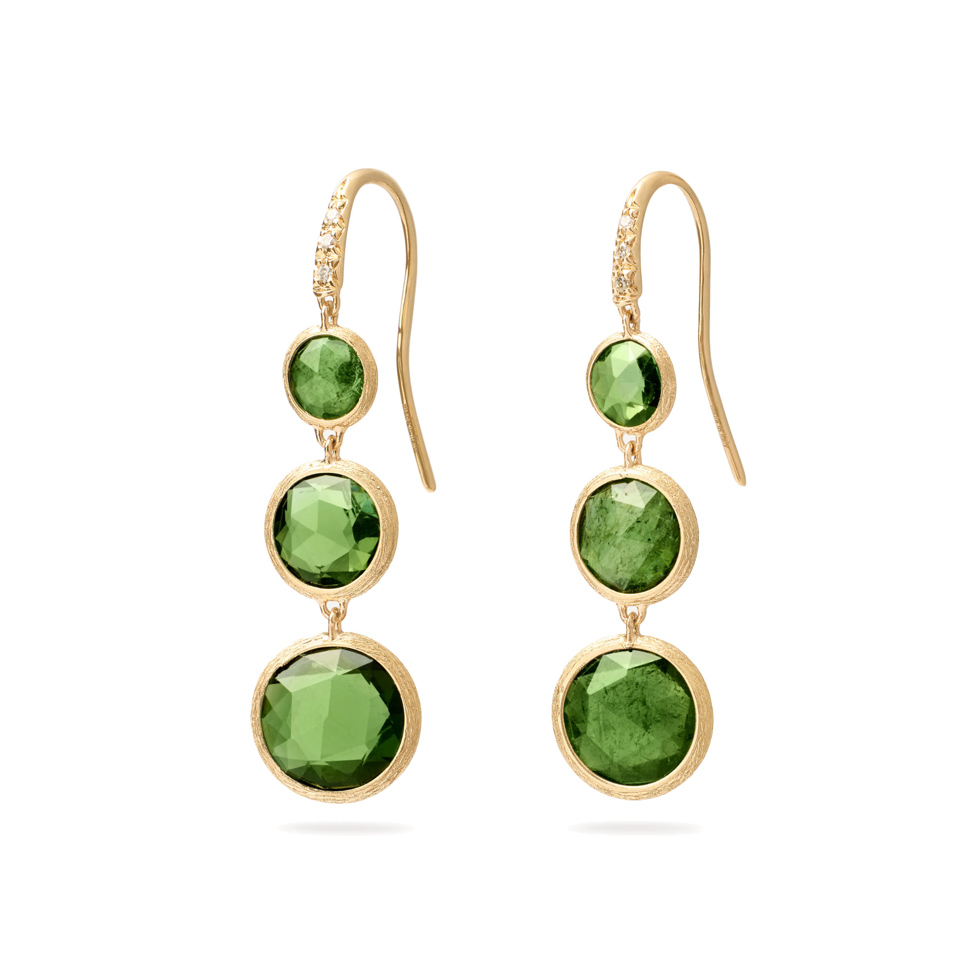 Ref. OB1752 AB TV01 Y - Diese Ohrhänger sind mit einem zarten Pavé-Diamant-Haken verziert und mit sechs grünen Turmalinen besetzt. Die Fassung aus 18 Karat Gelbgold ist mit der alten Florentiner Technik fein handgraviert.
