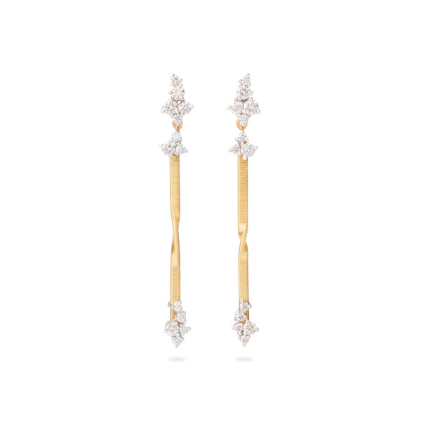 Ref. OG420 B YW - Diese eleganten und skulpturalen Hängeohrringe aus 18 Karat Gelbgold zeigen ein gedrehtes Band, das mit der exklusiven Coil-Technik gefertigt wurde. An den Enden schaffen zwei unregelmäßig gefasste Diamantpavés einen glanzvollen, dynamischen Effekt, der das Licht bei jeder Bewegung einfängt.