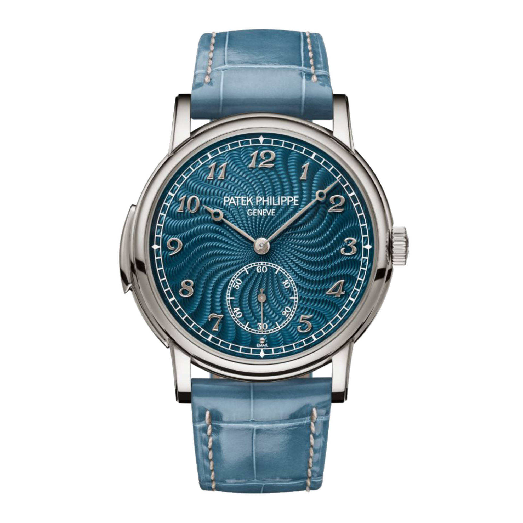 Handguillochiertes Kreismotiv unter transparentem, blauem Grand-Feu-Email („Flinker“-Email-Technik), aufgesetzte Breguet-Goldziffern. Zifferblatt aus 18K Gold