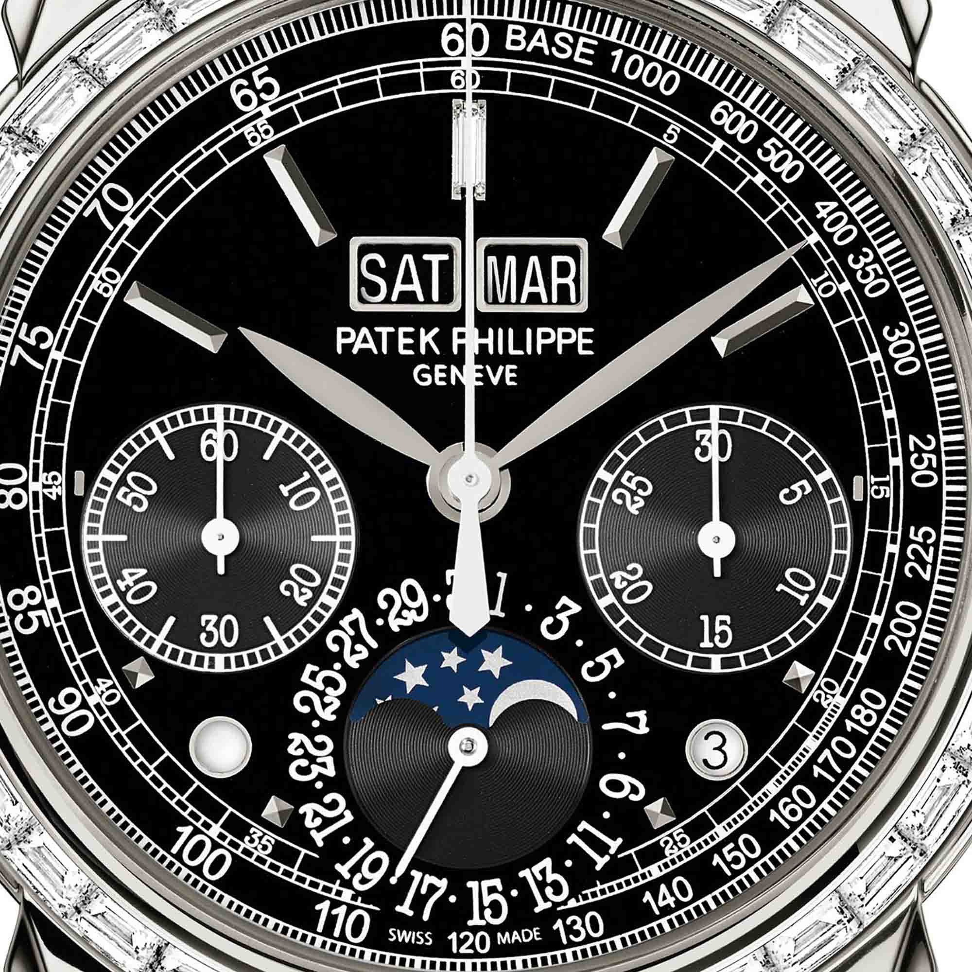 Ref. 5271P-010 - Als Hommage an eine legendäre Grande Complication hat Patek Philippe ihren Chronographen mit ewigem Kalender Referenz 5271 als Schmuckausführung geschaffen, auf der 81 Baguette-Diamanten (5,01 ct.) strahlen. Abgerundet wird ihre ausgewogene Ästhetik durch das lackierte schwarze Zifferblatt und das schwarz glänzende Alligator-Lederband.