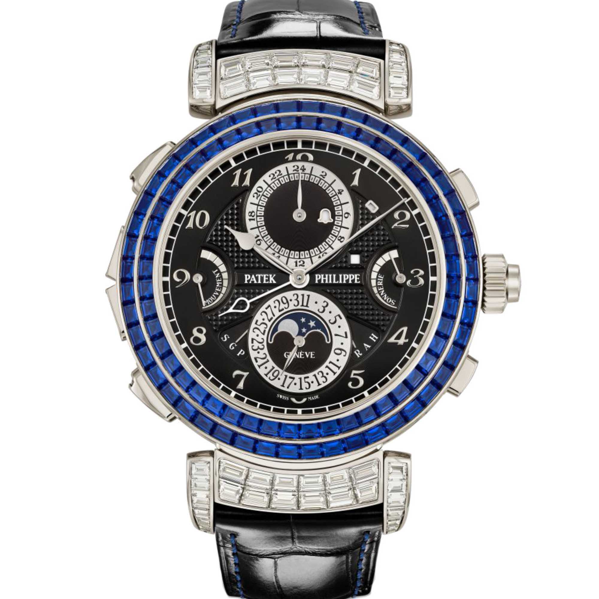 Ref. 6300/401G-001 - Exklusives Dekor aus Baguette-Saphiren für die komplizierteste Armbanduhr von Patek Philippe. Die Patek Philippe Grandmaster Chime wurde 2014 anlässlich des 175-jährigen Manufakturjubiläums vorgestellt. In einem Weißgoldgehäuse sowie mit schwarzen und weißen Zifferblättern fand sie 2016 ihren Platz in der aktuellen Kollektion. 2019 folgte eine Weißgold-Variante mit zwei opalblauen Zifferblättern (Referenz 6300G-010).