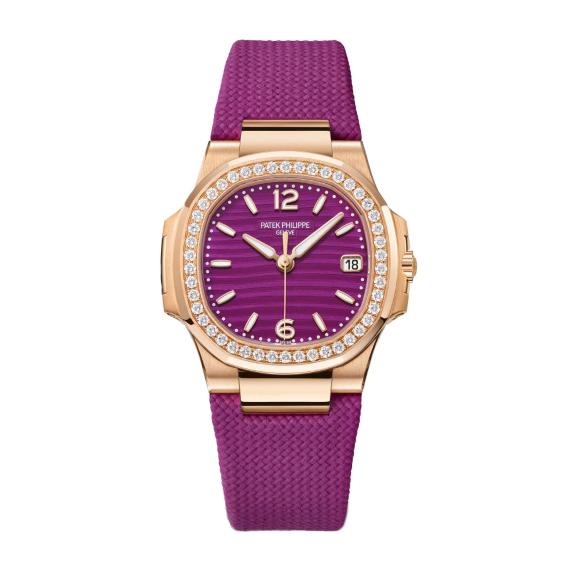 Ref. 7010R-013 - Ein neues sportlich-elegantes Modell in Violett für Damen. Die 2013 lancierte Nautilus Damenuhr mit Quarzwerk, einem Gehäuse mit 32 mm Durchmesser und edelsteinbesetzter Lünette ist in verschiedenen Varianten erhältlich. Patek Philippe interpretiert dieses sportlich-elegante Modell neu: Das Zifferblatt mit dem für die Kollektion der Nautilus Damenuhren typischen Wellenmotiv ist in einem eleganten Violett lackiert. Diese Farbe wiederholt sich auch auf dem Armband aus widerstandsfähigem Verbundmaterial mit Textilmuster und einer Nautilus Faltschließe in Roségold.