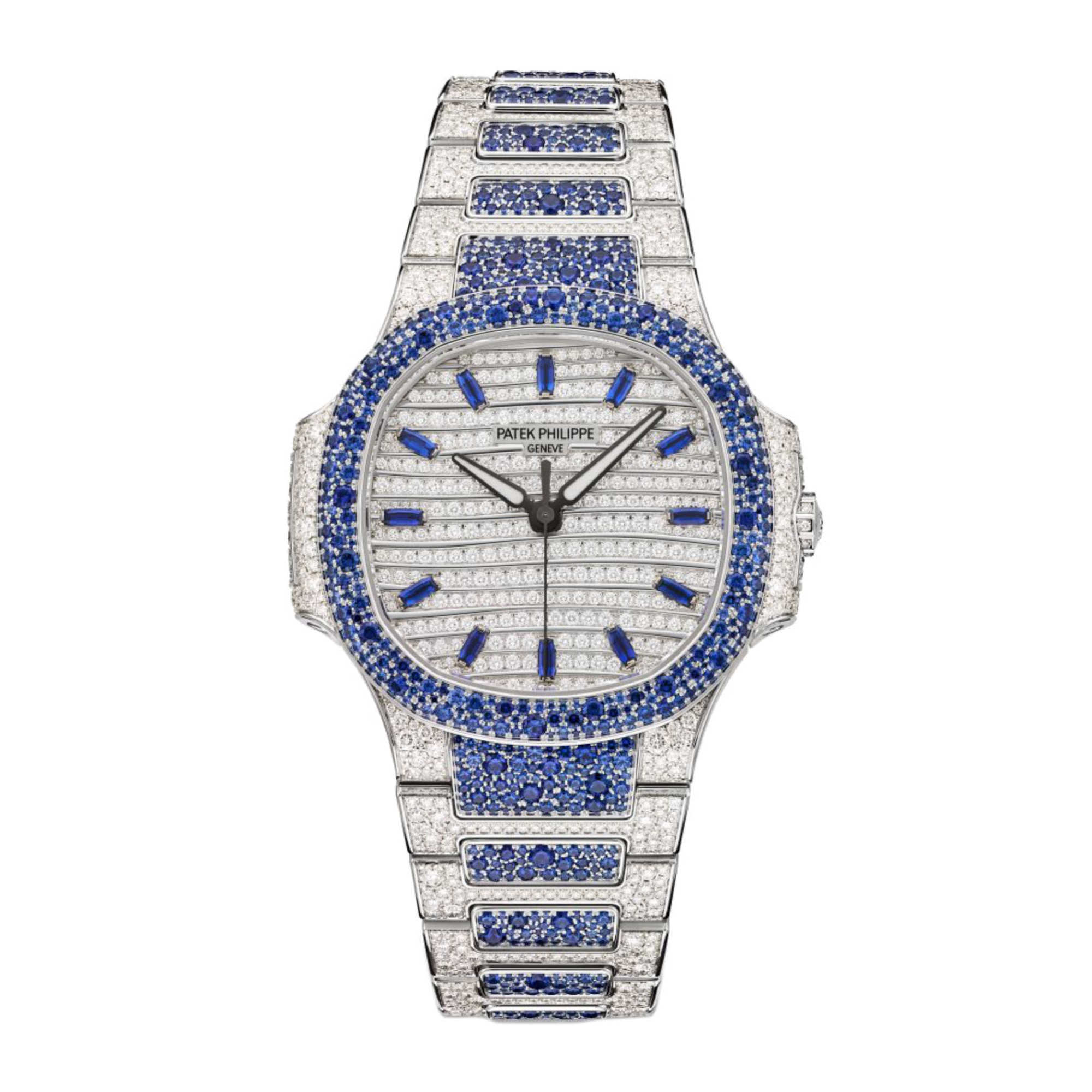 Ref. 7118/1451G-001 - Eine neue Variante mit in der Snow-Setting-Technik gefassten Diamanten und blauen Saphiren. Die Nautilus Damenuhr ist seit 2021 in zwei Haute-Joaillerie-Varianten mit Diamantbesatz in Snow-Setting-Technik in der Kollektion: eine in Roségold (Referenz 7118/1450R-001) und eine in Weißgold (Referenz 7118/1450G-001). Patek Philippe erweitert die Kollektion um eine neue Variante, bei der Diamanten mit blauen Saphiren kombiniert werden. Sie verleihen der Lünette, dem Zifferblatt und den Mittelgliedern des Armbands Farbe und Glanz. Das Dekor aus 1.500 Diamanten in lupenreiner Top-Wesselton-Qualität (6,53 K) und 876 blauen Saphiren (6,58 K) unterstreicht perfekt das ikonische Design der Nautilus mit ihrer achteckigen Lünette, die an die Form eines Bullauges erinnert, und dem integrierten, sich zur Schließe hin verjüngenden Armband.