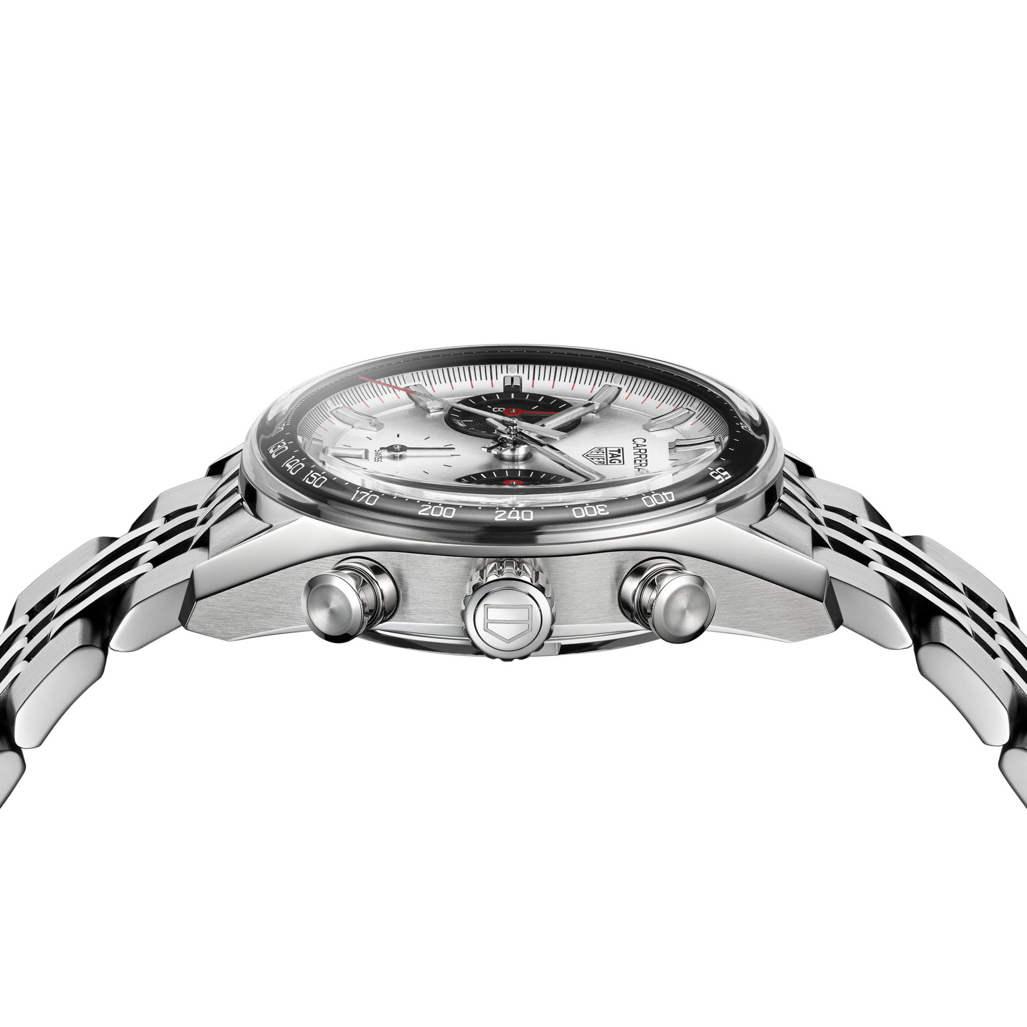 Stunden, Minuten, Sekunde, Chronograph: 1/4 Sekunde, 30-Minuten-Zähler, 12-Stunden-Zähler, Datum, Tachymeterskala